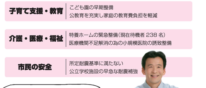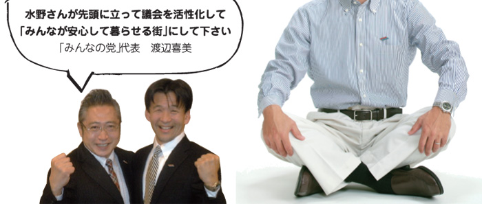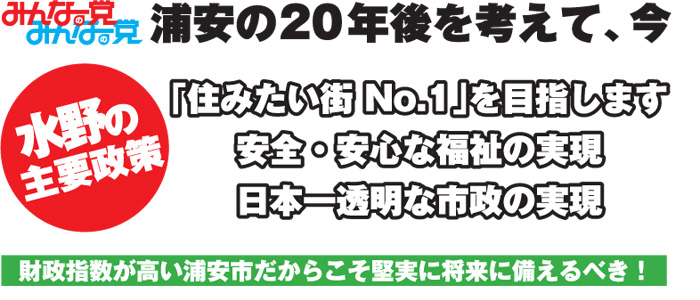 | 水野みのる政治スタンス ・思い込みや推測ではなく法令や実際の数値にもとづいた事実を市民に正確にお知らせします。 ・入札と補助金を精査し市民にとって本当に必要な事業に振り向けます。 ・議会採決時にはあくまで市民生活を最優先とした是是非非の態度で望みます。 ・企業・団体からの支援や献金は一切いただきません。 ・ 「市民の代理人」として“しがらみ”のない提言を行いコスト・費用対効果・行政サービスを精査します。 ・ 「する/しない」「出来る/出来ない」の2極論ではなく、常に“第3の案”を提案し問題解決に努めます。 |