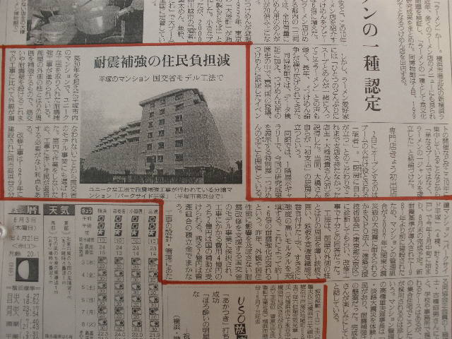 | 毎日新聞 2010年6月2日(水曜日)の紙面で 私が携わったマンション耐震補強工事が紹介されました。 | |